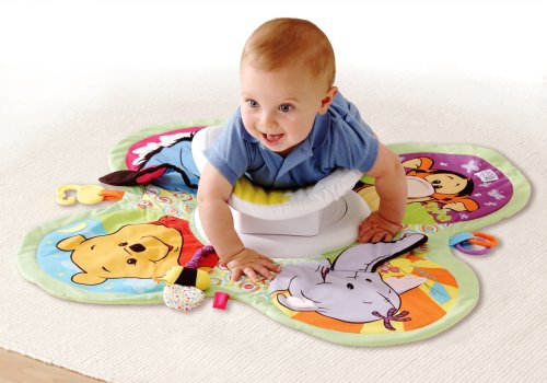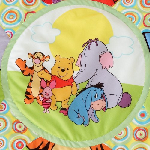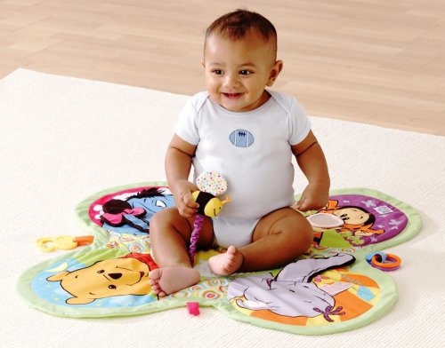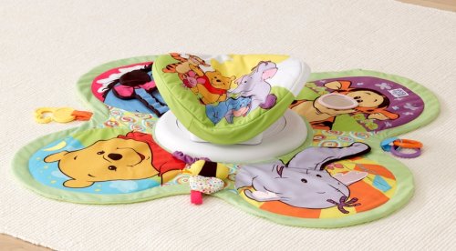 The Winnie the Pooh Spin Garden Gym provides a new format for one of the key developmental phases of a newborn: an innovative, fun platform for encouraging exploration, developing upper body strength and lower leg development through a unique shape and 360-degree rotating motion. The unique rotating tummy time spinner design encourages physical development as baby works to strengthen upper and lower body muscles. Employing a colorful play mat with varying texture and layers and beloved Winnie the Pooh characters, baby will be visually and physically stimulated by the fun developmental features. The play mat acts as a grow-with-me feature as baby will continue to enjoy exploring the multiple textures long after her tummy time development milestone has passed. Measures 5.25L x 32W x 32H.