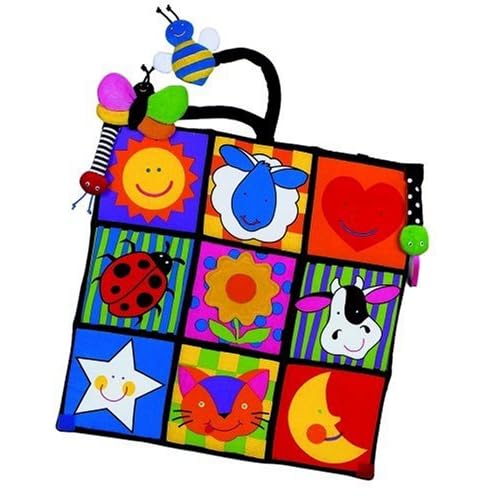 Colorful reversible playmat fantastic to hang in crib or in car! Also folds up as an activity triangle. Learn many different textures plus squeakers, crinkles, and rattles. Filled with bright colors and whimsical characters. Hand washable.
